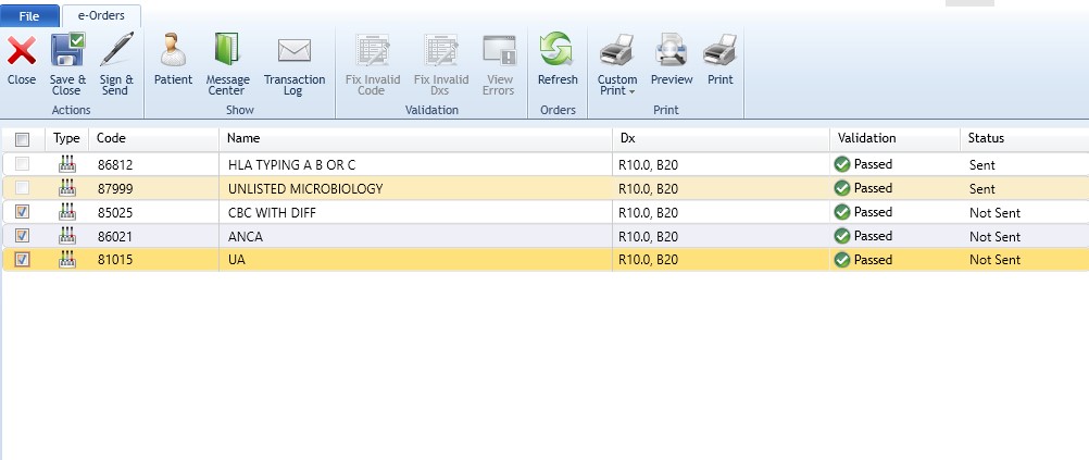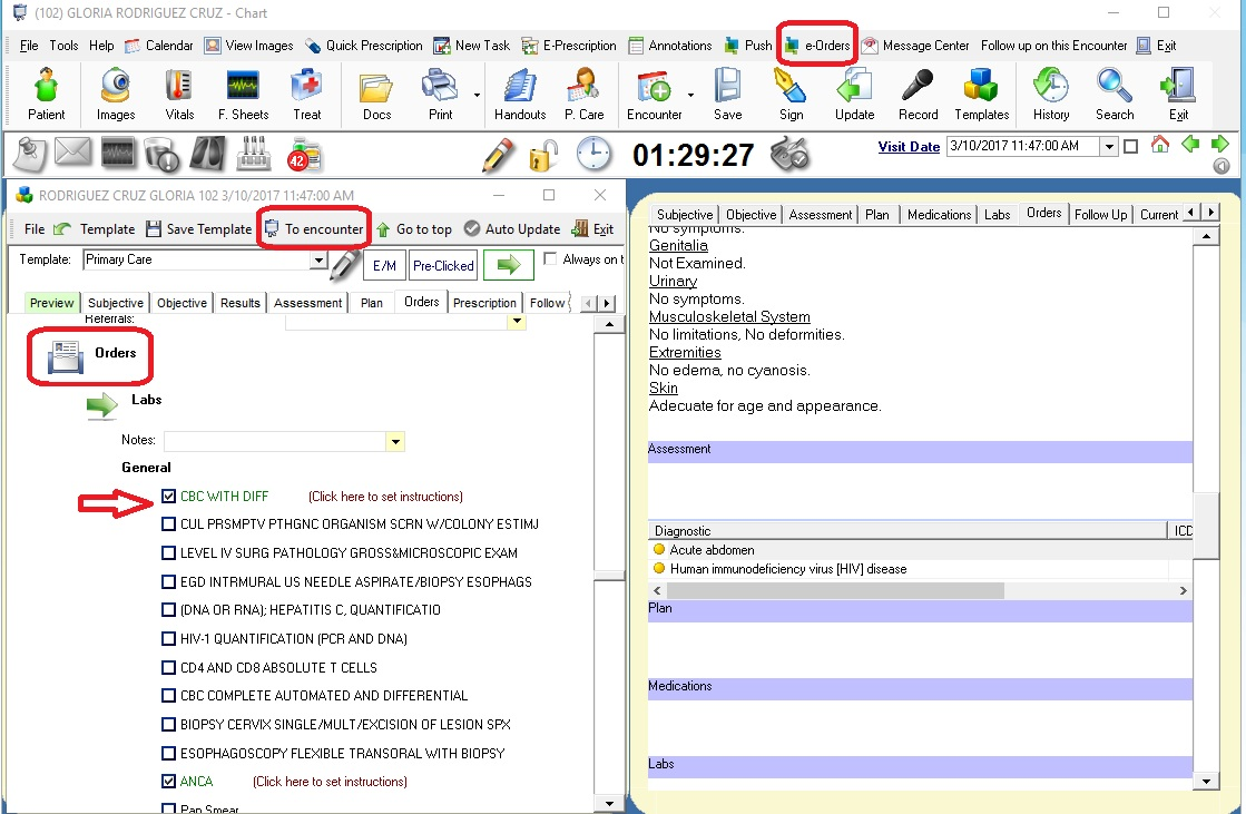 - Durante el encuentro, al llegar al área de Orders en el template, seleccione las pruebas de laboratorios marcando el encasillado correspondiente de cada una que le desea ordenar al paciente.