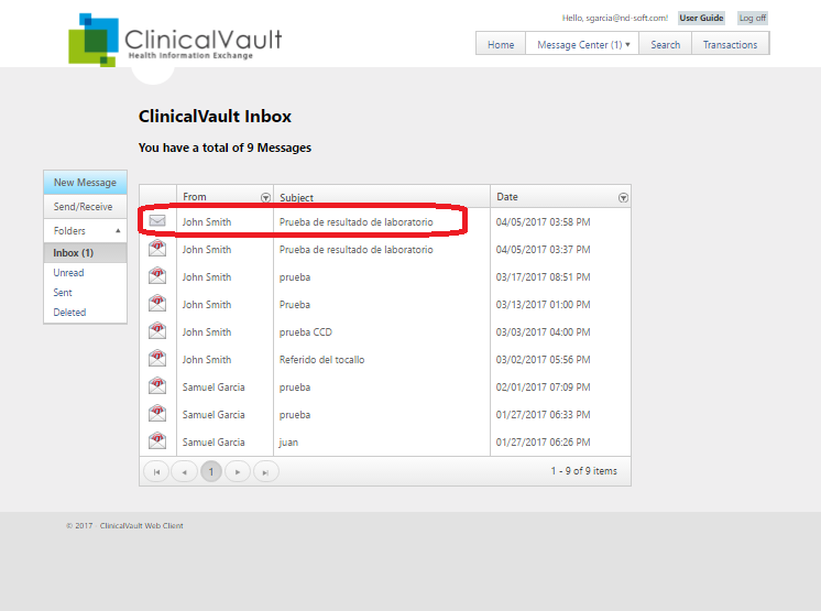 - Entre al WebClient y diríjase al área de Message Center, Inbox para ver los mensajes recibidos.